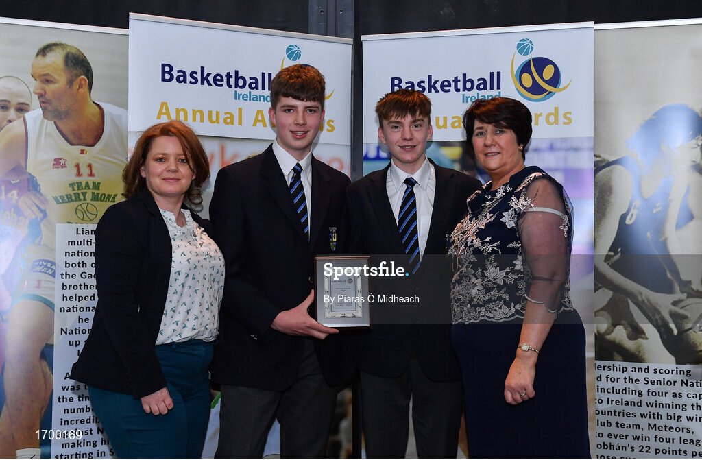 11 May 2019; Boys A School Award winners St Joseph’s The Bish, Galway, represented by Joseph Coughlan and Brian Gaffney, are presented with the award by Lorna Finnegan, PPSC, left, and Theresa Walsh, President of Basketball Ireland, during the Basketball Ireland 2018/19 Annual Awards and Hall of Fame at the Cusack Suite, Croke Park in Dublin. Photo by Piaras Ó Mídheach/Sportsfile