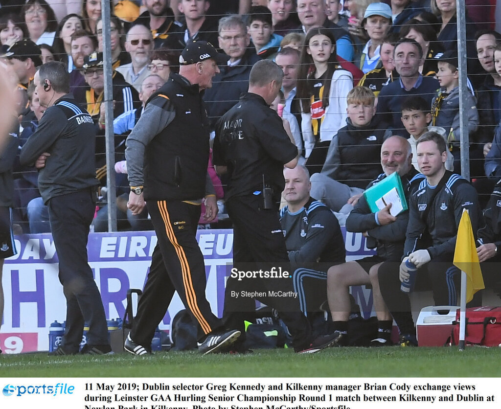11 May 2019; Dublin selector Greg Kennedy and Kilkenny manager Brian Cody exchange views during Leinster GAA Hurling Senior Championship Round 1 match between Kilkenny and Dublin at Nowlan Park in Kilkenny. Photo by Stephen McCarthy/Sportsfile