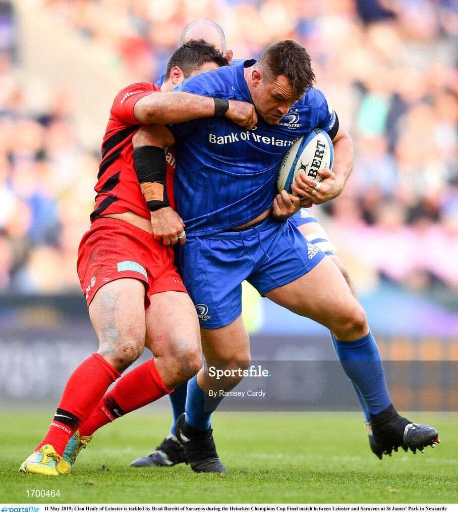 11 May 2019; Cian Healy of Leinster is tackled by Brad Barritt of Saracens during the Heineken Champions Cup Final match between Leinster and Saracens at St James' Park in Newcastle Upon Tyne, England. Photo by Ramsey Cardy/Sportsfile