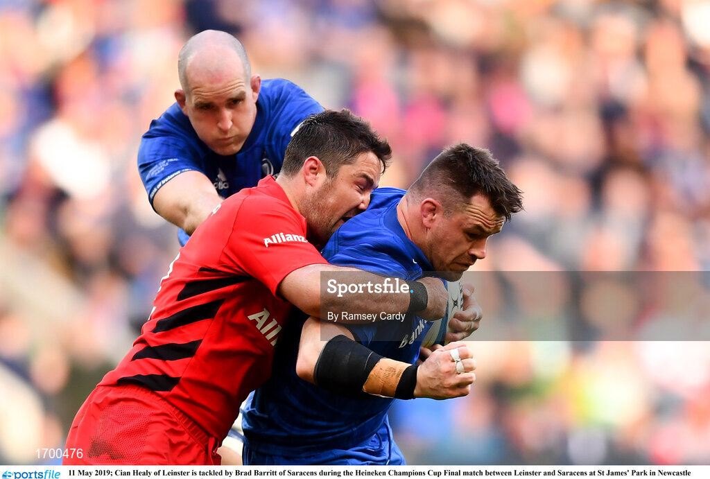 11 May 2019; Cian Healy of Leinster is tackled by Brad Barritt of Saracens during the Heineken Champions Cup Final match between Leinster and Saracens at St James' Park in Newcastle Upon Tyne, England. Photo by Ramsey Cardy/Sportsfile