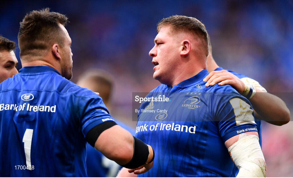 11 May 2019; Tadhg Furlong of Leinster is congratulated on scoring his side's first try by Cian Healy during the Heineken Champions Cup Final match between Leinster and Saracens at St James' Park in Newcastle Upon Tyne, England. Photo by Ramsey Cardy/Sportsfile