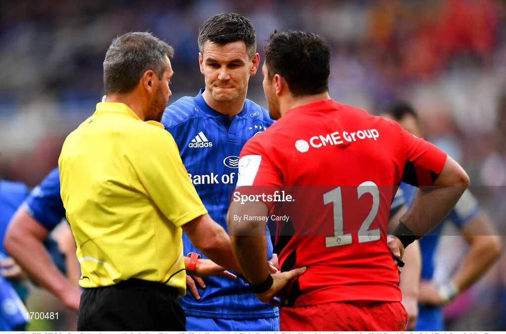 11 May 2019; Referee Jérome Garcès speaks to team captains Jonathan Sexton of Leinster and Brad Barritt of Saracens during the Heineken Champions Cup Final match between Leinster and Saracens at St James' Park in Newcastle Upon Tyne, England. Photo by Ramsey Cardy/Sportsfile