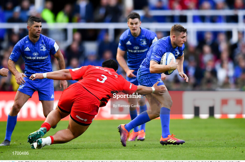 11 May 2019; Jordan Larmour of Leinster is tackled by Titi Lamositele of Saracens during the Heineken Champions Cup Final match between Leinster and Saracens at St James' Park in Newcastle Upon Tyne, England. Photo by Ramsey Cardy/Sportsfile