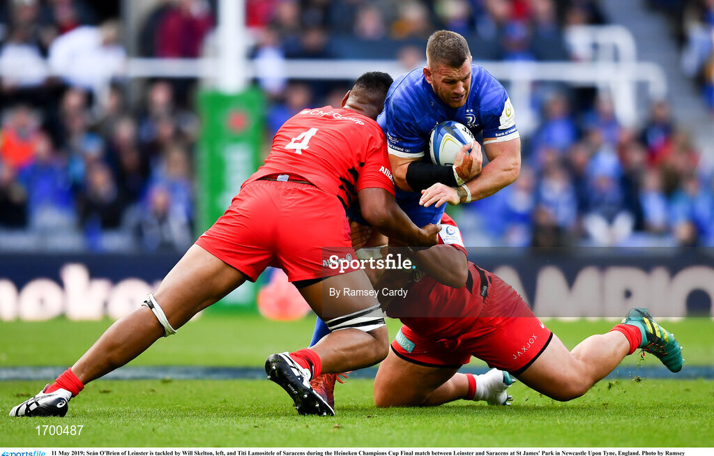 11 May 2019; Seán O'Brien of Leinster is tackled by Will Skelton, left, and Titi Lamositele of Saracens during the Heineken Champions Cup Final match between Leinster and Saracens at St James' Park in Newcastle Upon Tyne, England. Photo by Ramsey Cardy/Sportsfile