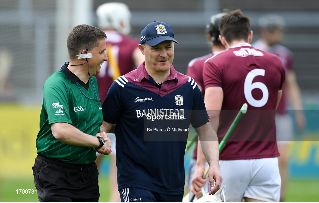 12 May 2019; Galway manager Micheál Donoghue with referee Colm Lyons before the Leinster GAA Hurling Senior Championship Round 1 match between Galway and Carlow at Pearse Stadium in Galway. Photo by Piaras Ó Mídheach/Sportsfile