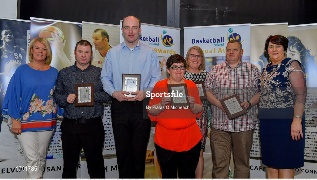 11 May 2019; Table Official of the Year Award winners George Fitzgerald, Andrew Byrne, Philomena O’Hare, Deborah McArdle, representing Fiona Brady, and Denis O’Gorman are presented with their awards by Paula Ryan Kavanagh, left, and Theresa Walsh, President of Basketball Ireland, during the Basketball Ireland 2018/19 Annual Awards and Hall of Fame at the Cusack Suite, Croke Park in Dublin. Photo by Piaras Ó Mídheach/Sportsfile