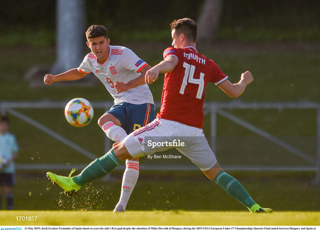 13 May 2019; Jordi Escobar Fernández of Spain shoots to score his side's first goal despite the attention of Milán Horváth of Hungary during the 2019 UEFA European Under-17 Championships Quarter-Final match between Hungary and Spain at UCD Bowl in Dublin. Photo by Ben McShane/Sportsfile