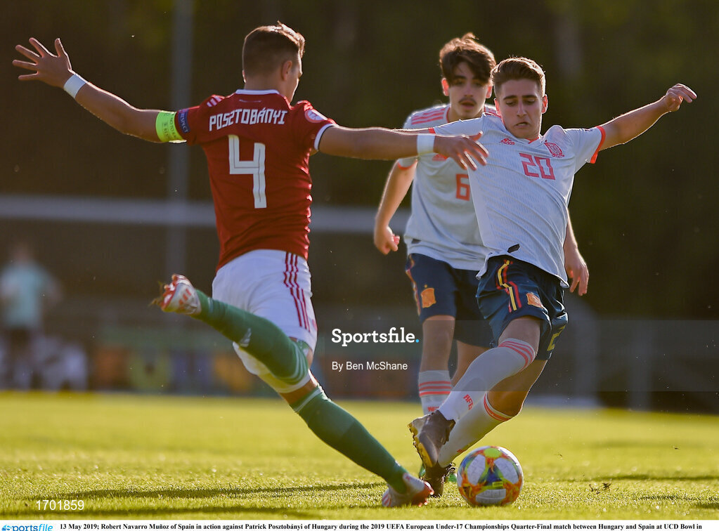 13 May 2019; Robert Navarro Muñoz of Spain in action against Patrick Posztobányi of Hungary during the 2019 UEFA European Under-17 Championships Quarter-Final match between Hungary and Spain at UCD Bowl in Dublin. Photo by Ben McShane/Sportsfile