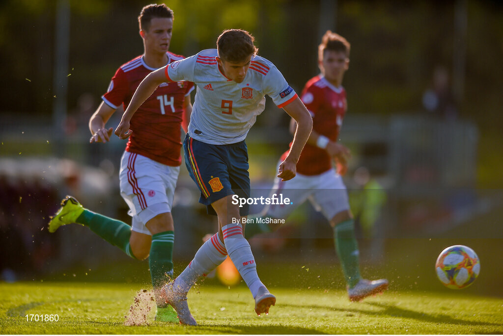 13 May 2019; Jordi Escobar Fernández of Spain has a shot on goal during the 2019 UEFA European Under-17 Championships Quarter-Final match between Hungary and Spain at UCD Bowl in Dublin. Photo by Ben McShane/Sportsfile
