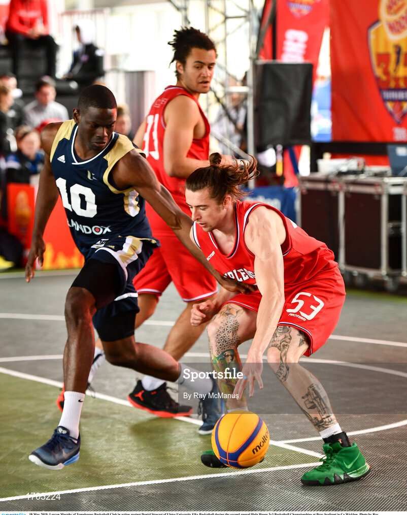 18 May 2019; Lorcan Murphy of Templeogue Basketball Club in action against Daniel Stewart of Ulster University Elks Basketball during the second annual Hula Hoops 3x3 Basketball Championships at Bray Seafront in Co.Wicklow. Photo by Ray McManus/Sportsfile