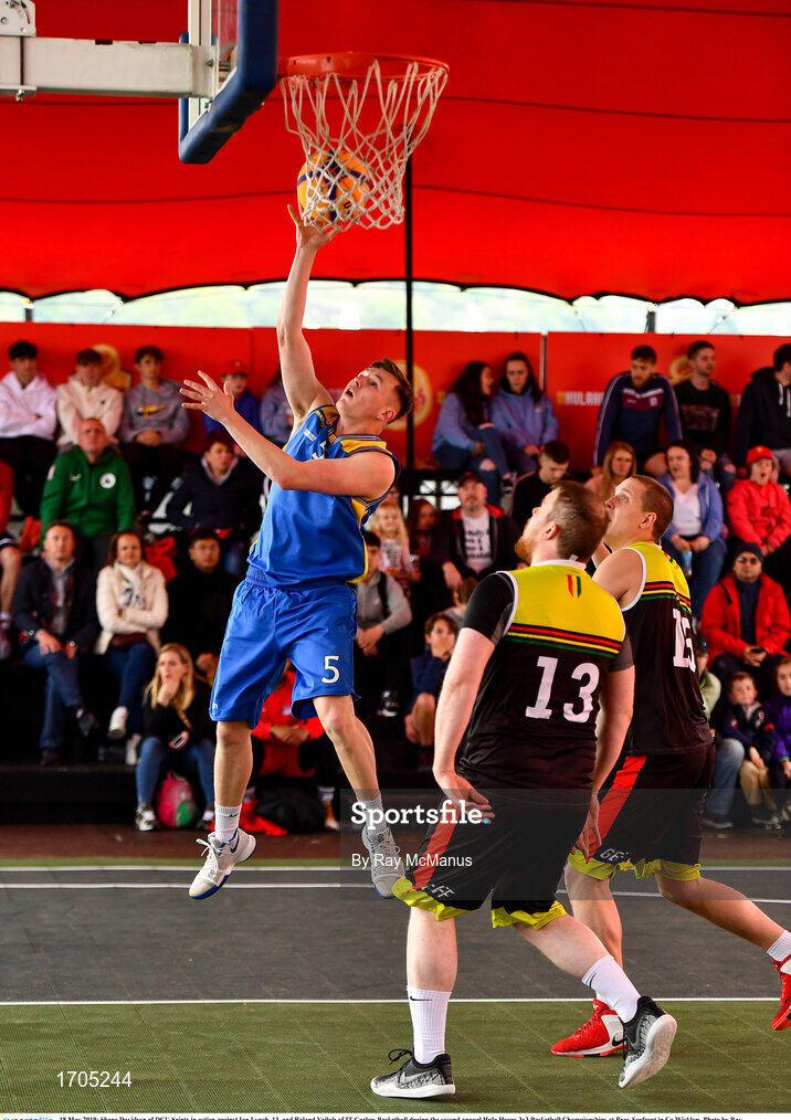 18 May 2019; Shane Davidson of DCU Saints in action against Ian Lynch, 13, and Roland Vailuls of IT Carlow Basketball during the second annual Hula Hoops 3x3 Basketball Championships at Bray Seafront in Co.Wicklow. Photo by Ray McManus/Sportsfile