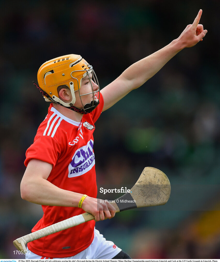 19 May 2019; Darragh Flynn of Cork celebrates scoring his side's first goal during the Electric Ireland Munster Minor Hurling Championship match between Limerick and Cork at the LIT Gaelic Grounds in Limerick. Photo by Piaras Ó Mídheach/Sportsfile