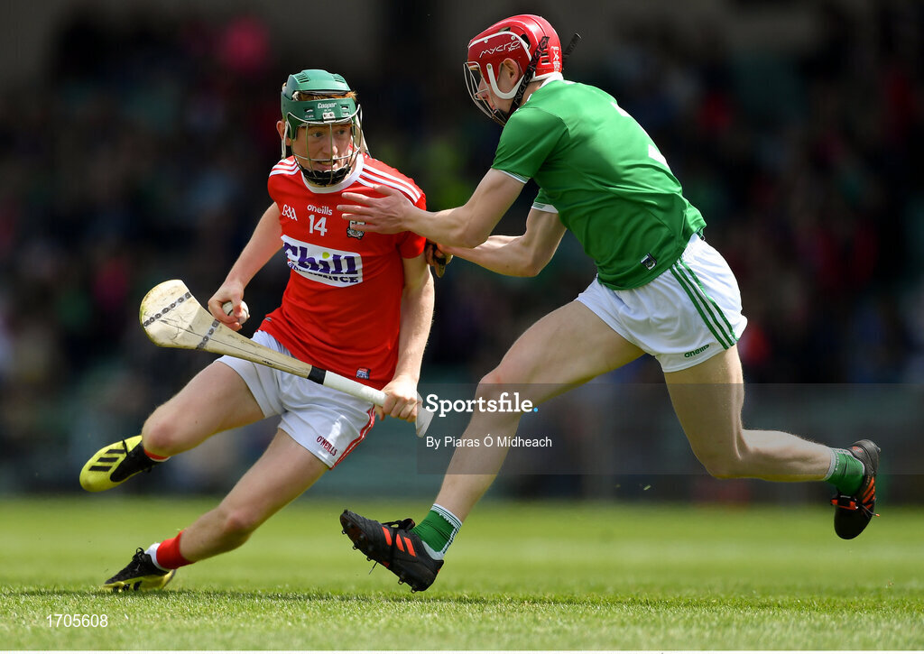19 May 2019; Jack Cahalane of Cork in action against Michael Keane of Limerick during the Electric Ireland Munster Minor Hurling Championship match between Limerick and Cork at the LIT Gaelic Grounds in Limerick. Photo by Piaras Ó Mídheach/Sportsfile