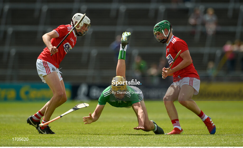 19 May 2019; Cathal O'Neill of Limerick in action against Ethan Twomey, left, and Brian O'Sullivan of Cork during the Electric Ireland Munster Minor Hurling Championship match between Limerick and Cork at the LIT Gaelic Grounds in Limerick. Photo by Diarmuid Greene/Sportsfile