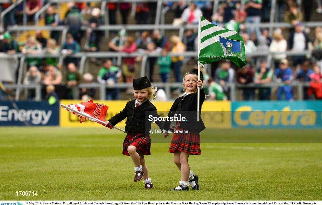 19 May 2019; Sisters Mairead Purcell, aged 3, left, and Clodagh Purcell, aged 5, from the CBS Pipe Band, prior to the Munster GAA Hurling Senior Championship Round 2 match between Limerick and Cork at the LIT Gaelic Grounds in Limerick. Photo by Diarmuid Greene/Sportsfile
