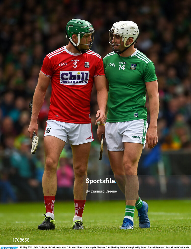19 May 2019; Eoin Cadogan of Cork and Aaron Gillane of Limerick during the Munster GAA Hurling Senior Championship Round 2 match between Limerick and Cork at the LIT Gaelic Grounds in Limerick. Photo by Diarmuid Greene/Sportsfile