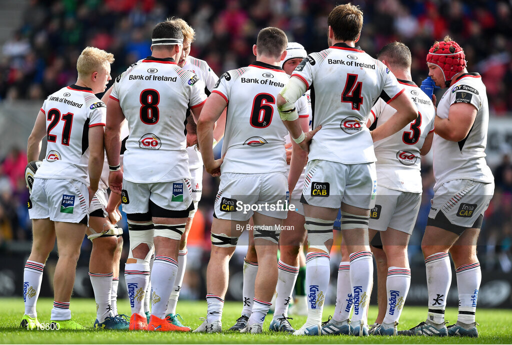 4 May 2019; Ulster captain Rory Best, 4th from right, speaks to his players during the Guinness PRO14 quarter-final match between Ulster and Connacht at Kingspan Stadium in Belfast. Photo by Brendan Moran/Sportsfile