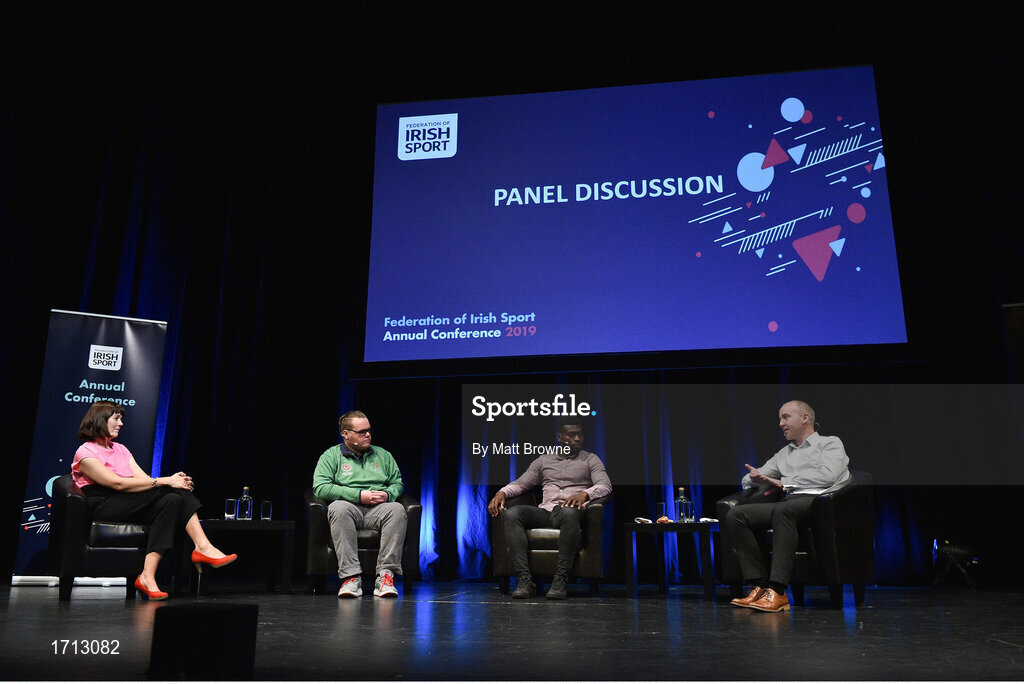 23 May 2019; Presenter Grainne McElwain with from left Oisin Feery from Special Olympian Ireland, Boidu Sayeh, Westmeath footballer and Nicky Hamill from the Irish Wheelchair Association pictured at the Federation of Irish Sport Annual Conference 2019, The Helix, Dublin City University, Dublin. Photo by Matt Browne/Sportsfile