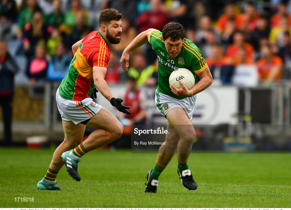 25 May 2019; Pádraic Harnan of Meath in action against Daniel St Ledger of Carlow during the Leinster GAA Football Senior Championship Quarter-Final match between Carlow and Meath at O’Moore Park in Portlaoise, Laois. Photo by Ray McManus/Sportsfile