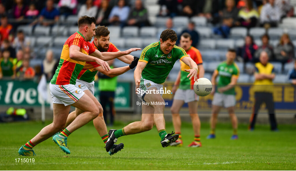 25 May 2019; Pádraic Harnan of Meath in action against Daniel St Ledger and Eoghan Ruth, left, of Carlow during the Leinster GAA Football Senior Championship Quarter-Final match between Carlow and Meath at O’Moore Park in Portlaoise, Laois. Photo by Ray McManus/Sportsfile