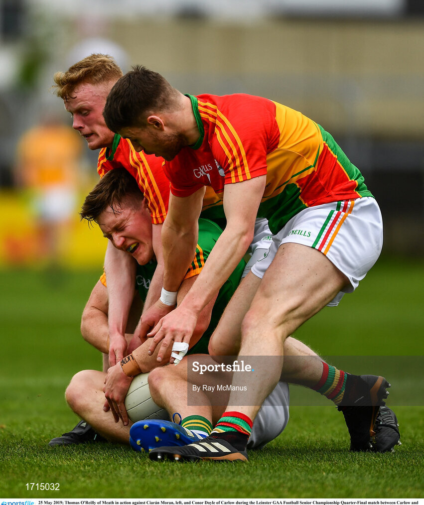 25 May 2019; Thomas O'Reilly of Meath in action against Ciarán Moran, left, and Conor Doyle of Carlow during the Leinster GAA Football Senior Championship Quarter-Final match between Carlow and Meath at O’Moore Park in Portlaoise, Laois. Photo by Ray McManus/Sportsfile