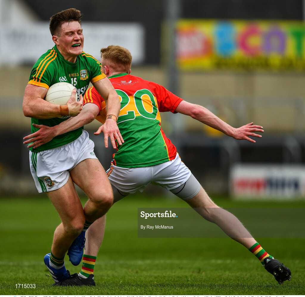 25 May 2019; Thomas O'Reilly of Meath in action against and Conor Doyle of Carlow during the Leinster GAA Football Senior Championship Quarter-Final match between Carlow and Meath at O’Moore Park in Portlaoise, Laois. Photo by Ray McManus/Sportsfile