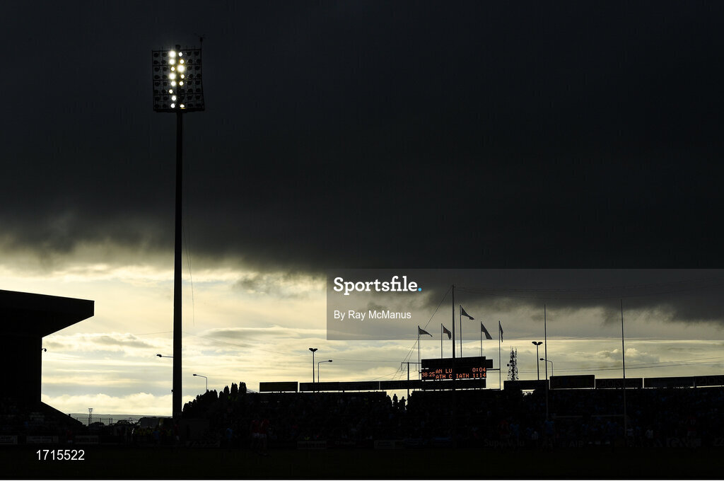 25 May 2019; The sun sets behind the town goal during the Leinster GAA Football Senior Championship Quarter-Final match between Louth and Dublin at O’Moore Park in Portlaoise, Laois. Photo by Ray McManus/Sportsfile