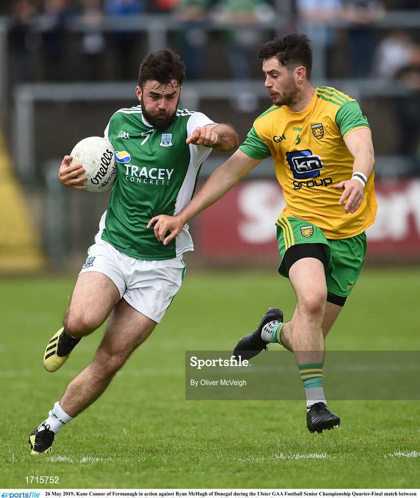 26 May 2019; Kane Connor of Fermanagh in action against Ryan McHugh of Donegal during the Ulster GAA Football Senior Championship Quarter-Final match between Fermanagh and Donegal at Brewster Park in Enniskillen, Fermanagh. Photo by Oliver McVeigh/Sportsfile