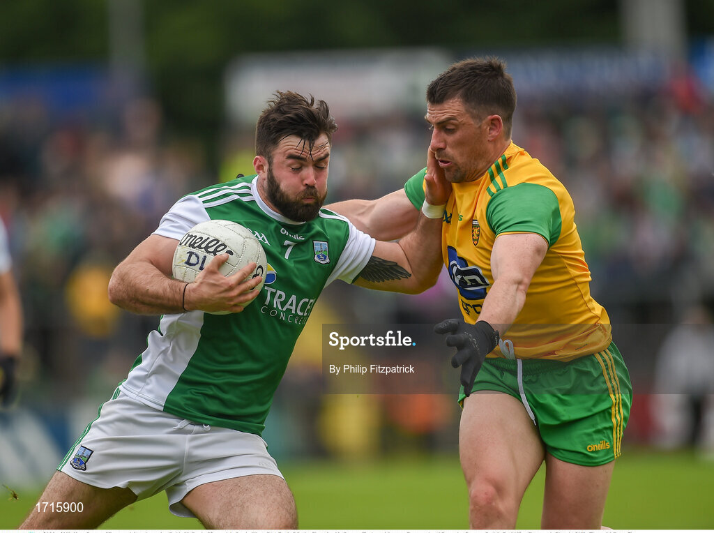 26 May 2019; Kane Connor of Fermanagh in action against Paddy McGrath of Donegal during the Ulster GAA Football Senior Championship Quarter-Final match between Fermanagh and Donegal at Brewster Park in Enniskillen, Fermanagh. Photo by Philip Fitzpatrick/Sportsfile