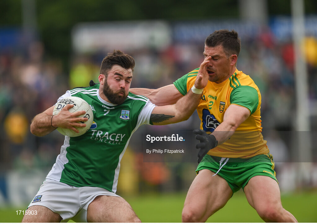 26 May 2019; Kane Connor of Fermanagh in action against Paddy McGrath of Donegal during the Ulster GAA Football Senior Championship Quarter-Final match between Fermanagh and Donegal at Brewster Park in Enniskillen, Fermanagh. Photo by Philip Fitzpatrick/Sportsfile