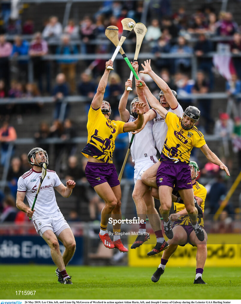 26 May 2019; Lee Chin, left, and Liam Og McGovern of Wexford in action against Aidan Harte, left, and Joseph Cooney of Galway during the Leinster GAA Hurling Senior Championship Round 3A match between Galway and Wexford at Pearse Stadium in Galway. Photo by Stephen McCarthy/Sportsfile