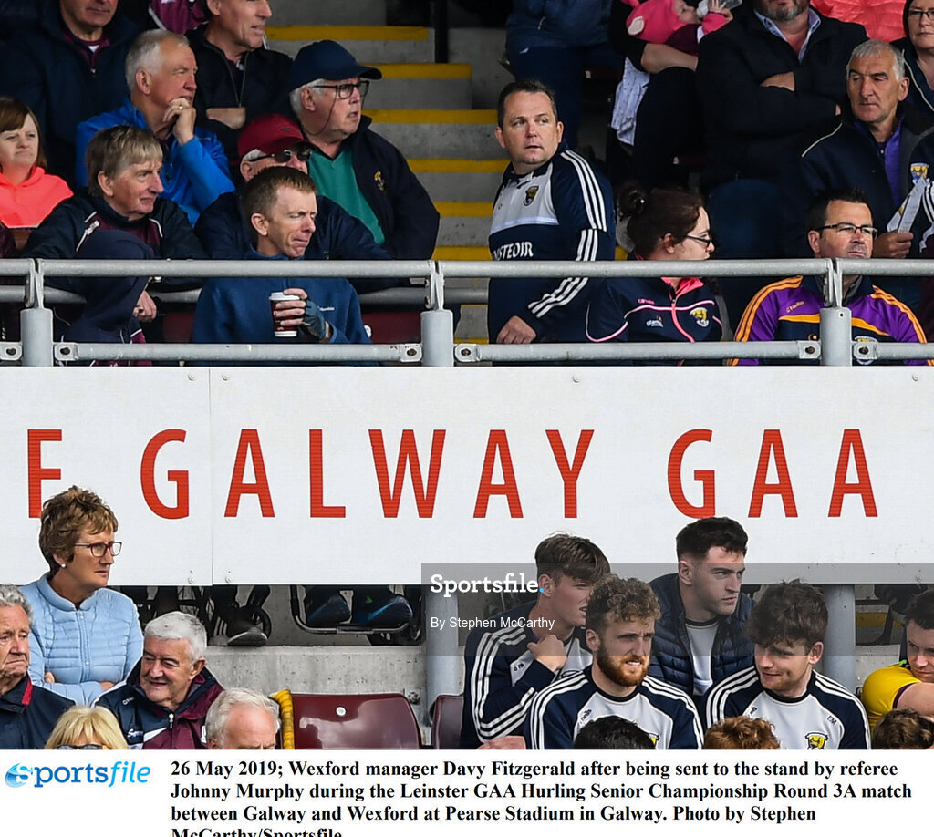 26 May 2019; Wexford manager Davy Fitzgerald after being sent to the stand by referee Johnny Murphy during the Leinster GAA Hurling Senior Championship Round 3A match between Galway and Wexford at Pearse Stadium in Galway. Photo by Stephen McCarthy/Sportsfile