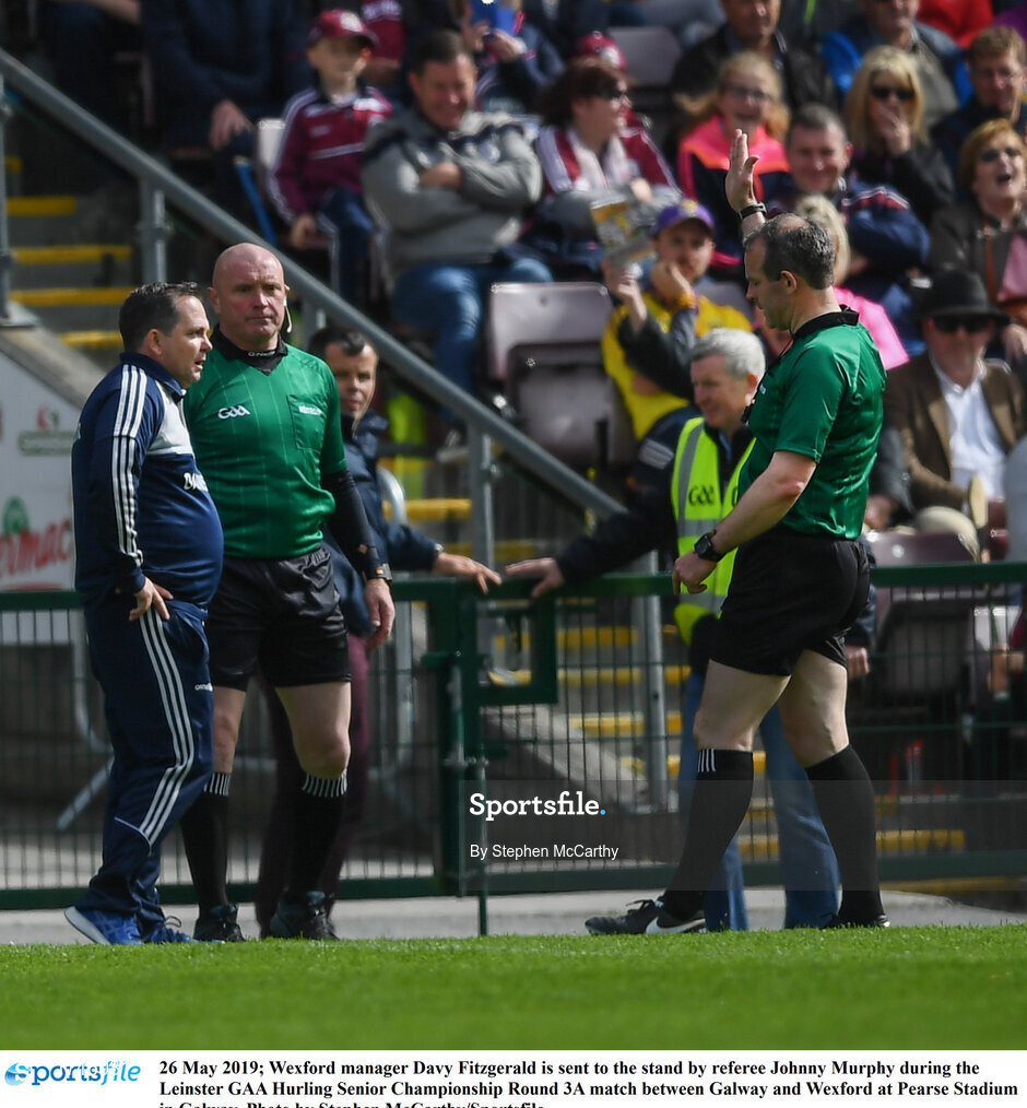 26 May 2019; Wexford manager Davy Fitzgerald is sent to the stand by referee Johnny Murphy during the Leinster GAA Hurling Senior Championship Round 3A match between Galway and Wexford at Pearse Stadium in Galway. Photo by Stephen McCarthy/Sportsfile