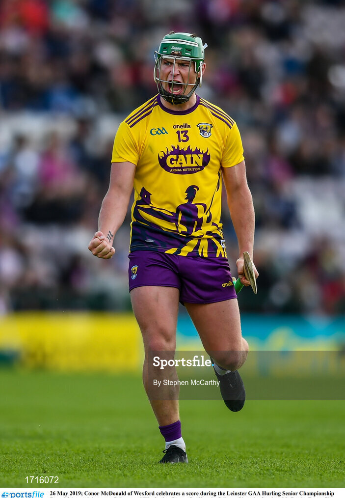 26 May 2019; Conor McDonald of Wexford celebrates a score during the Leinster GAA Hurling Senior Championship Round 3A match between Galway and Wexford at Pearse Stadium in Galway. Photo by Stephen McCarthy/Sportsfile