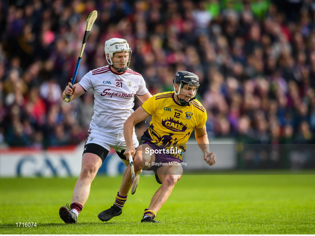 26 May 2019; Jack O'Connor of Wexford in action against John Hanbury of Galway during the Leinster GAA Hurling Senior Championship Round 3A match between Galway and Wexford at Pearse Stadium in Galway. Photo by Stephen McCarthy/Sportsfile