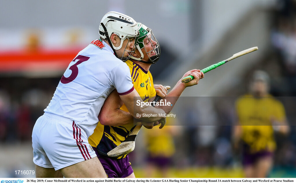 26 May 2019; Conor McDonald of Wexford in action against Daithí Burke of Galway during the Leinster GAA Hurling Senior Championship Round 3A match between Galway and Wexford at Pearse Stadium in Galway. Photo by Stephen McCarthy/Sportsfile