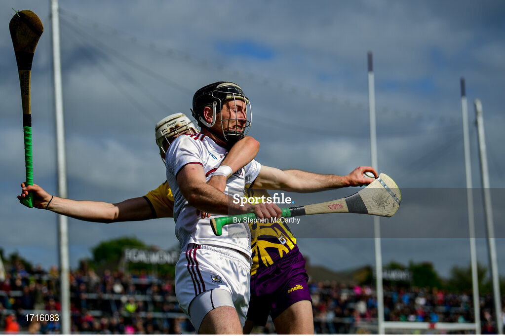 26 May 2019; Padraic Mannion of Galway in action against Rory O'Connor of Wexford during the Leinster GAA Hurling Senior Championship Round 3A match between Galway and Wexford at Pearse Stadium in Galway. Photo by Stephen McCarthy/Sportsfile