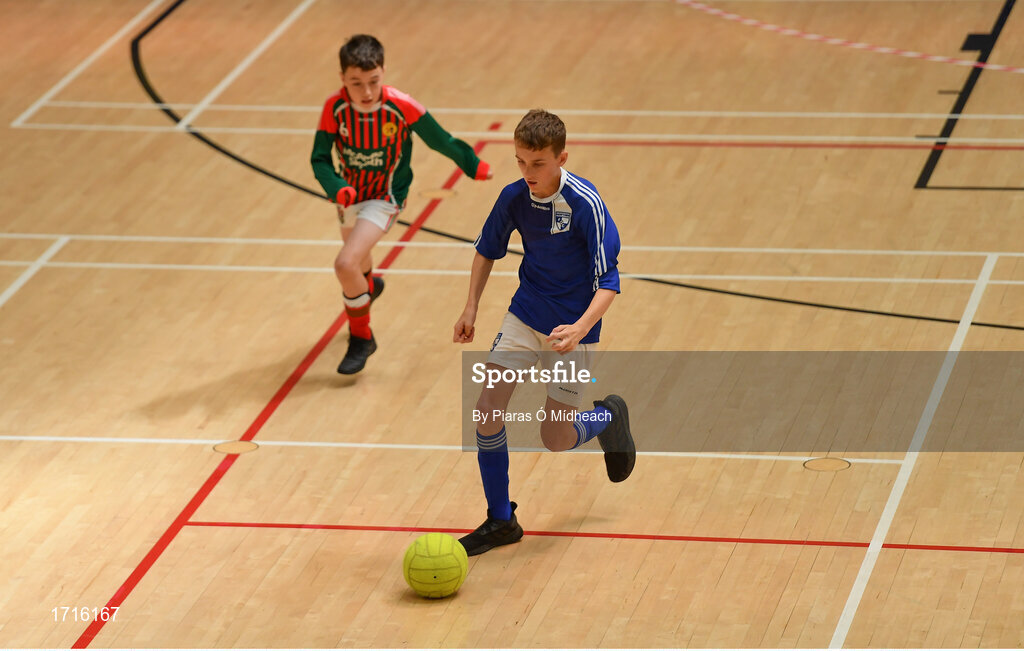 26 May 2019; Jamie Dorr of Clonguish, Co Longford, front, in action against Danny Downey of Inniskeen, Co Monaghan, in the Indoor Soccer U13 Boys Semi-Final during Day 2 of the Aldi Community Games May Festival, which saw over 3,500 children take part in a fun-filled weekend at University of Limerick. Photo by Piaras Ó Mídheach/Sportsfile