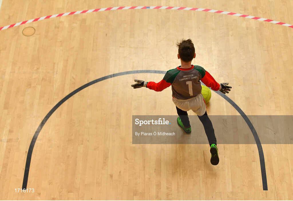 26 May 2019; Goalkeeper Conor McKeown of Inniskeen, Co Monaghan, takes a kick-out in the Indoor Soccer U13 Boys Semi-Final event during Day 2 of the Aldi Community Games May Festival, which saw over 3,500 children take part in a fun-filled weekend at University of Limerick. Photo by Piaras Ó Mídheach/Sportsfile
