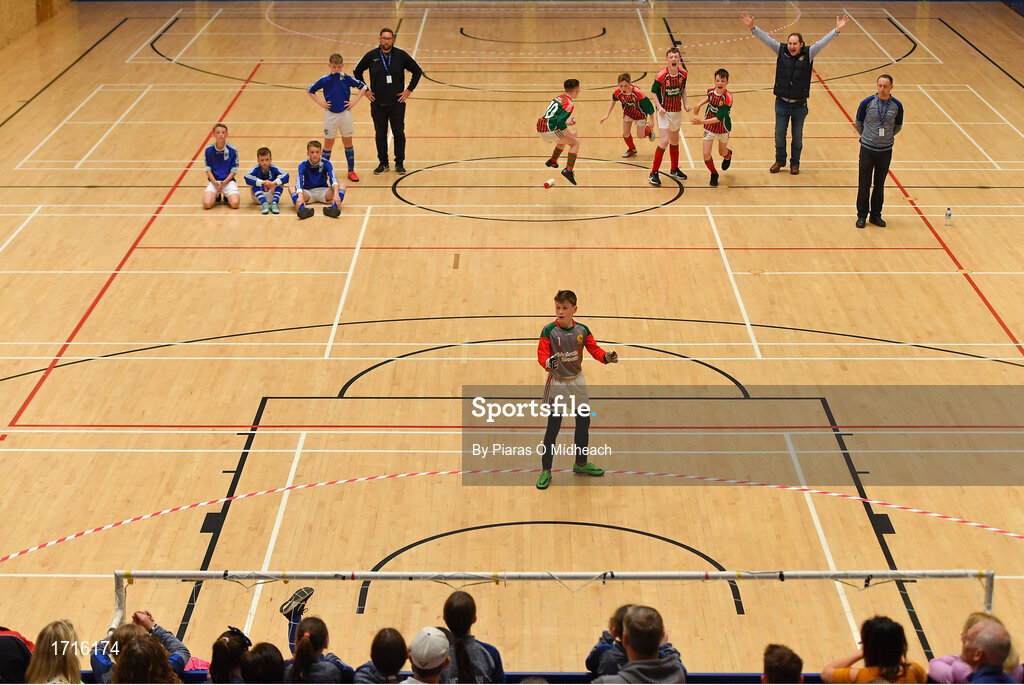 26 May 2019; Goalkeeper Conor McKeown of Inniskeen, Co Monaghan, celebrates after scoring the winning penalty in the penalty shoot-out at the Indoor Soccer U13 Boys Semi-Final against Clonguish, Co Longford, during Day 2 of the Aldi Community Games May Festival, which saw over 3,500 children take part in a fun-filled weekend at University of Limerick. Photo by Piaras Ó Mídheach/Sportsfile