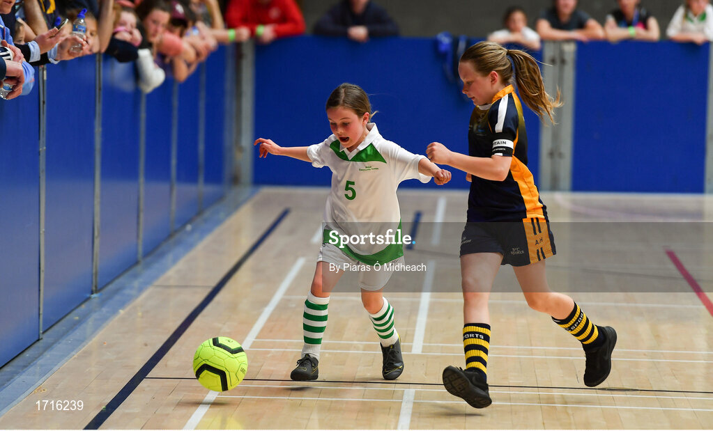 26 May 2019; Faye Gibney of Killoe, Co Longford, left, in action against Abbie Horgan of Boherlahan Dualla, Co Tipperary, in the indoor soccer U10 Girls final during Day 2 of the Aldi Community Games May Festival, which saw over 3,500 children take part in a fun-filled weekend at University of Limerick. Photo by Piaras Ó Mídheach/Sportsfile