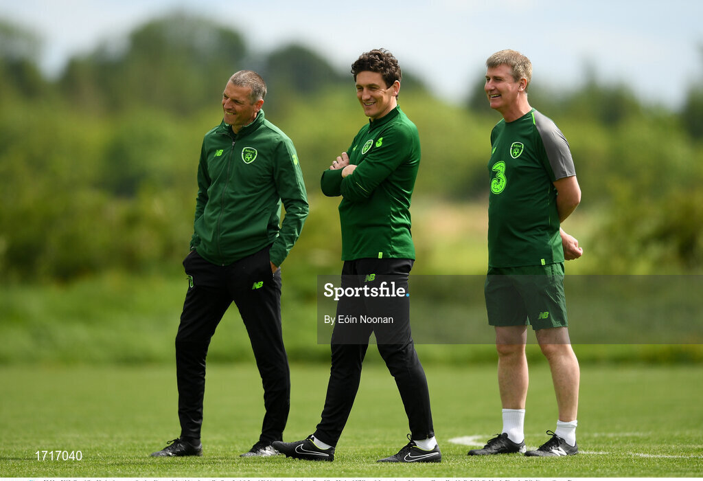 28 May 2019; Republic of Ireland manager Stephen Kenny, right with assistant Jim Crawford, left and Keith Andrews during a Republic of Ireland U21's training session at Johnstown House Hotel in Enfield, Co Meath. Photo by Eóin Noonan/Sportsfile
