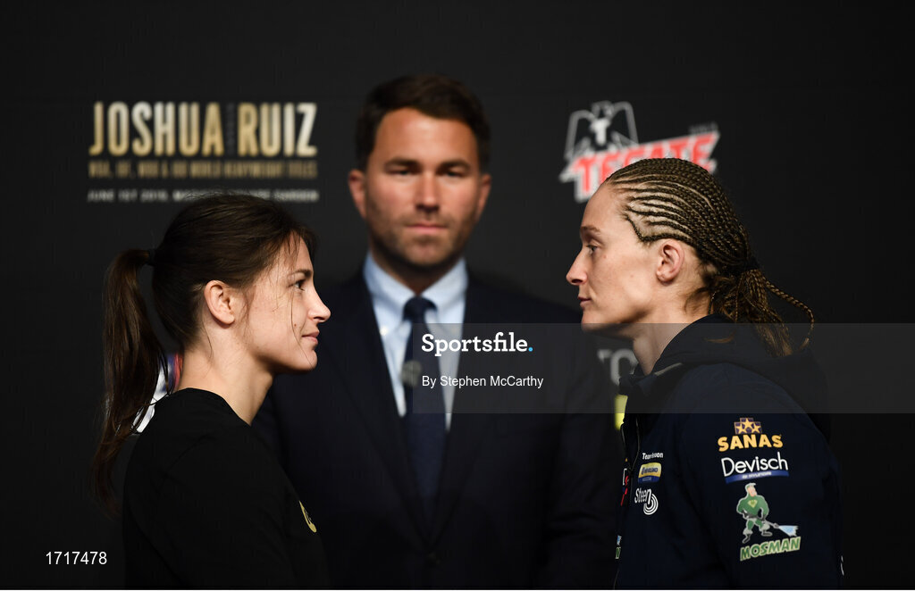 29 May 2019; Katie Taylor, left, and Delfine Persoon square off, in the company of promoter Eddie Hearn, following a press conference at Madison Square Garden ahead of their IBO, WBA, WBC & WBO unification bout in New York, USA. Photo by Stephen McCarthy/Sportsfile