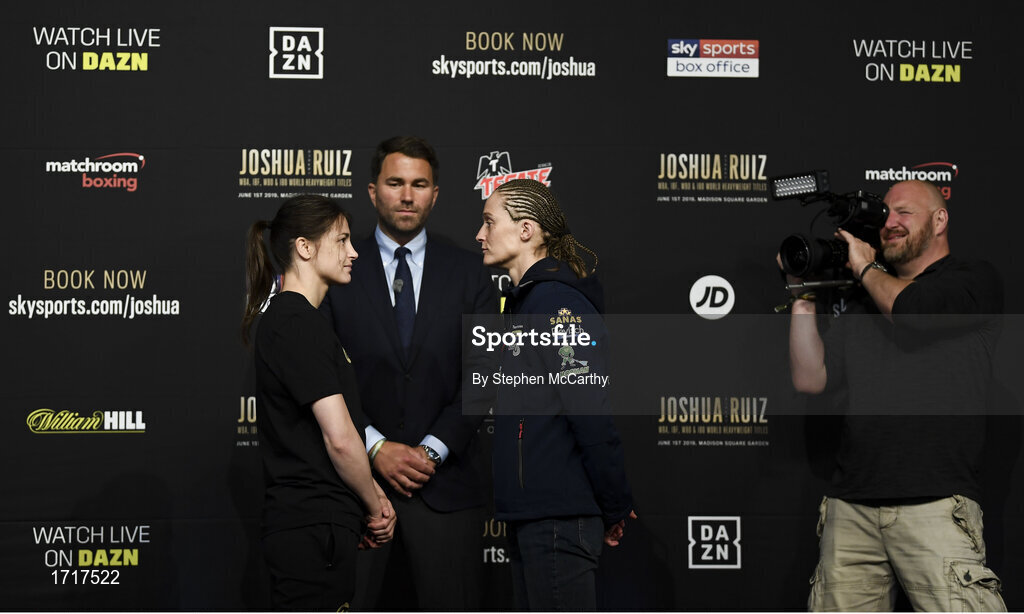 29 May 2019; Katie Taylor, left, and Delfine Persoon square off, in the company of promoter Eddie Hearn, following a press conference at Madison Square Garden ahead of their IBO, WBA, WBC & WBO unification bout in New York, USA. Photo by Stephen McCarthy/Sportsfile