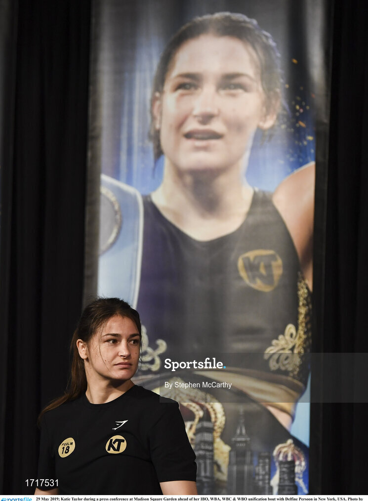 29 May 2019; Katie Taylor during a press conference at Madison Square Garden ahead of her IBO, WBA, WBC & WBO unification bout with Delfine Persoon in New York, USA. Photo by Stephen McCarthy/Sportsfile