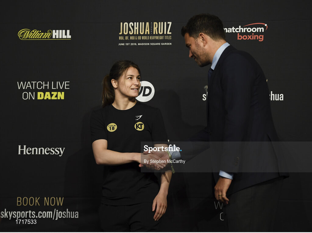 29 May 2019; Katie Taylor and promoter Eddie Hearn following a press conference at Madison Square Garden ahead of her IBO, WBA, WBC & WBO unification bout with Delfine Persoon in New York, USA. Photo by Stephen McCarthy/Sportsfile