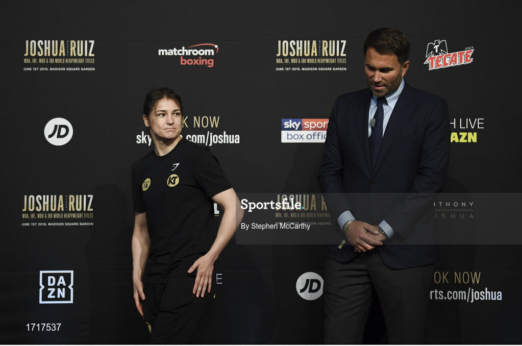29 May 2019; Katie Taylor and promoter Eddie Hearn following a press conference at Madison Square Garden ahead of her IBO, WBA, WBC & WBO unification bout with Delfine Persoon in New York, USA. Photo by Stephen McCarthy/Sportsfile