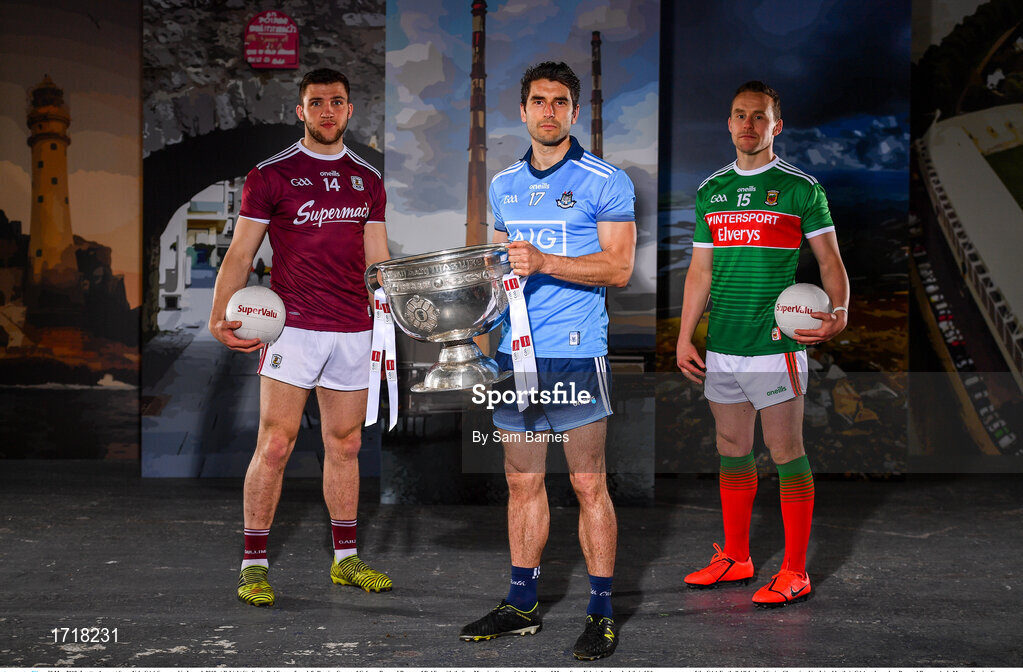 30 May 2019; In attendance at SuperValu GAA Sponsorship Launch 2019 at D-Light Studios in Dublin are, from left, Damien Comer of Galway, Bernard Brogan of Dublin, with the Sam Maguire Cup, and Andy Moran of Mayo. SuperValu today launched their 10th year as sponsor of the GAA Football All-Ireland Senior Championship. Joined by their GAA ambassadors Bernard Brogan, Andy Moran, Damien Comer, Doireann O’Sullivan and Valerie Mulcahy – SuperValu revealed that they will contribute over €2.6 million to the GAA and GAA Clubs across the country, this year. Throughout their 10-years as GAA sponsor, SuperValu has contributed over €18 million to aid the development of our national sport. Photo by Sam Barnes/Sportsfile