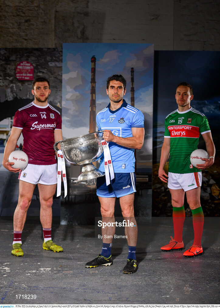30 May 2019; In attendance at SuperValu GAA Sponsorship Launch 2019 at D-Light Studios in Dublin are, from left, Damien Comer of Galway, Bernard Brogan of Dublin, with the Sam Maguire Cup, and Andy Moran of Mayo. SuperValu today launched their 10th year as sponsor of the GAA Football All-Ireland Senior Championship. Joined by their GAA ambassadors Bernard Brogan, Andy Moran, Damien Comer, Doireann O’Sullivan and Valerie Mulcahy – SuperValu revealed that they will contribute over €2.6 million to the GAA and GAA Clubs across the country, this year. Throughout their 10-years as GAA sponsor, SuperValu has contributed over €18 million to aid the development of our national sport. Photo by Sam Barnes/Sportsfile