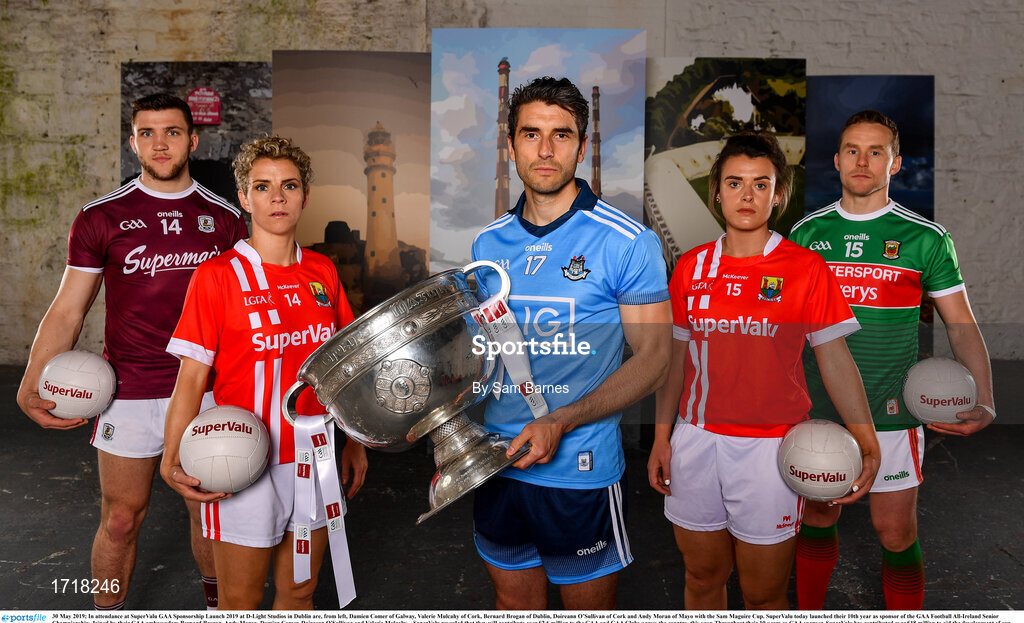 30 May 2019; In attendance at SuperValu GAA Sponsorship Launch 2019 at D-Light Studios in Dublin are, from left, Damien Comer of Galway, Valerie Mulcahy of Cork, Bernard Brogan of Dublin, Doireann O’Sullivan of Cork and Andy Moran of Mayo with the Sam Maguire Cup. SuperValu today launched their 10th year as sponsor of the GAA Football All-Ireland Senior Championship. Joined by their GAA ambassadors Bernard Brogan, Andy Moran, Damien Comer, Doireann O’Sullivan and Valerie Mulcahy – SuperValu revealed that they will contribute over €2.6 million to the GAA and GAA Clubs across the country, this year. Throughout their 10-years as GAA sponsor, SuperValu has contributed over €18 million to aid the development of our national sport. Photo by Sam Barnes/Sportsfile